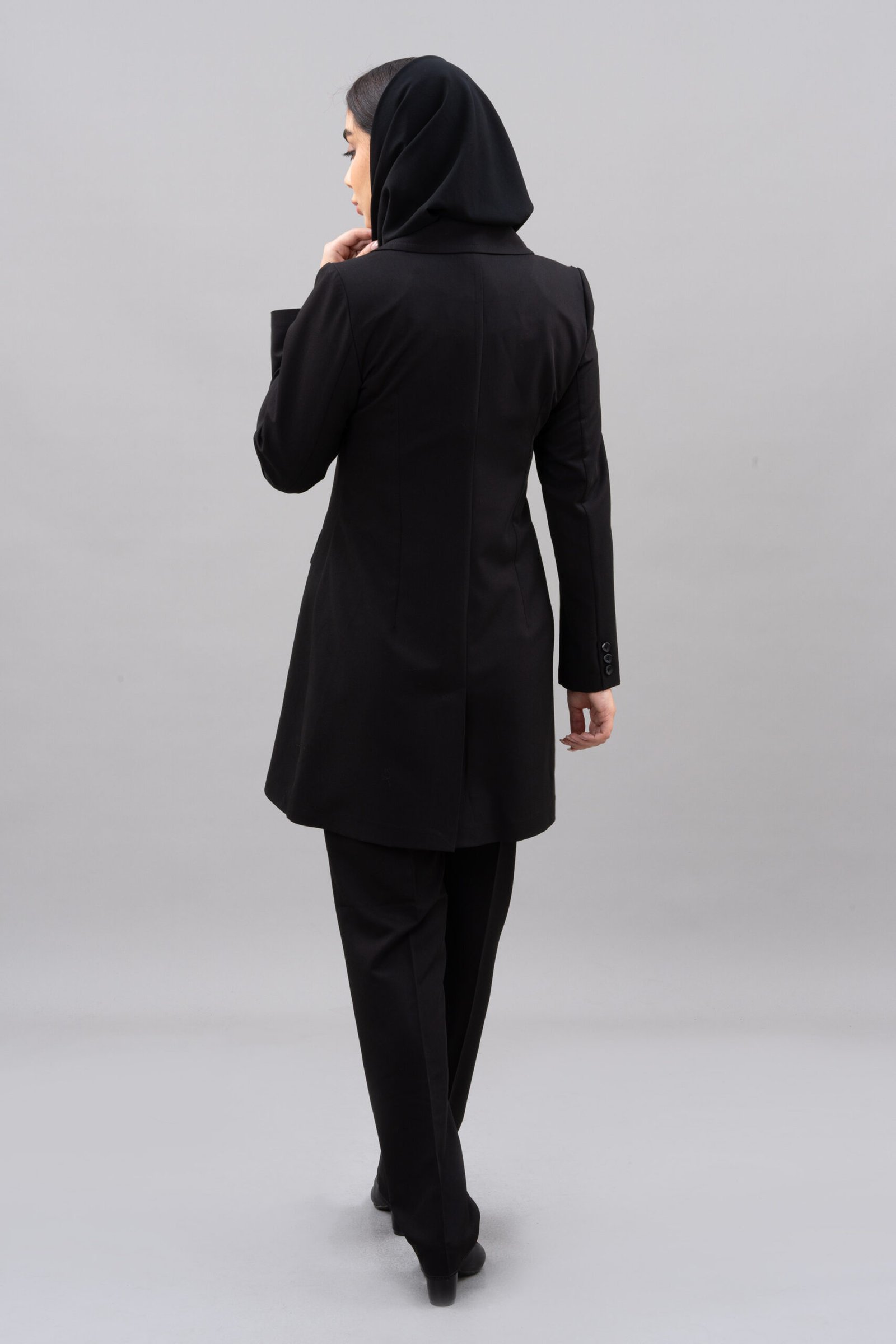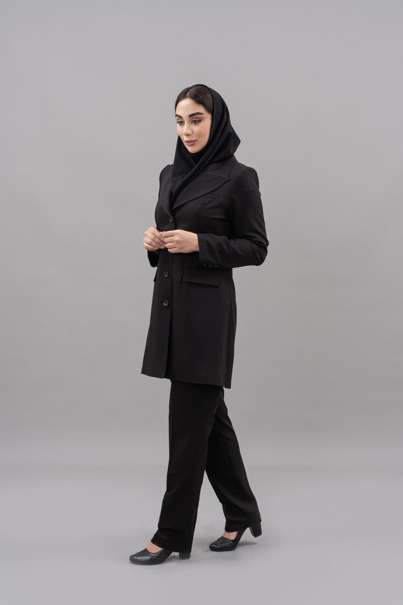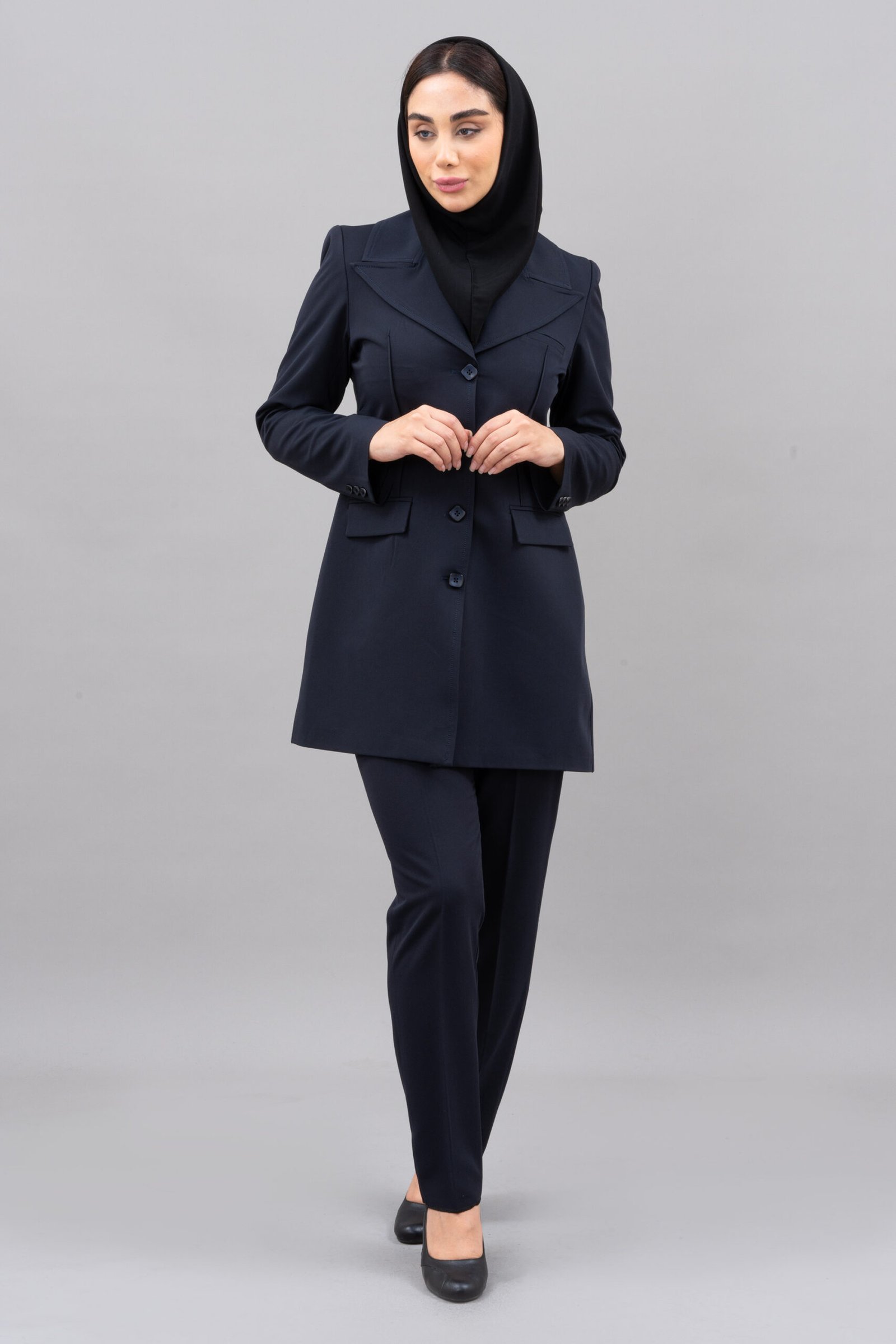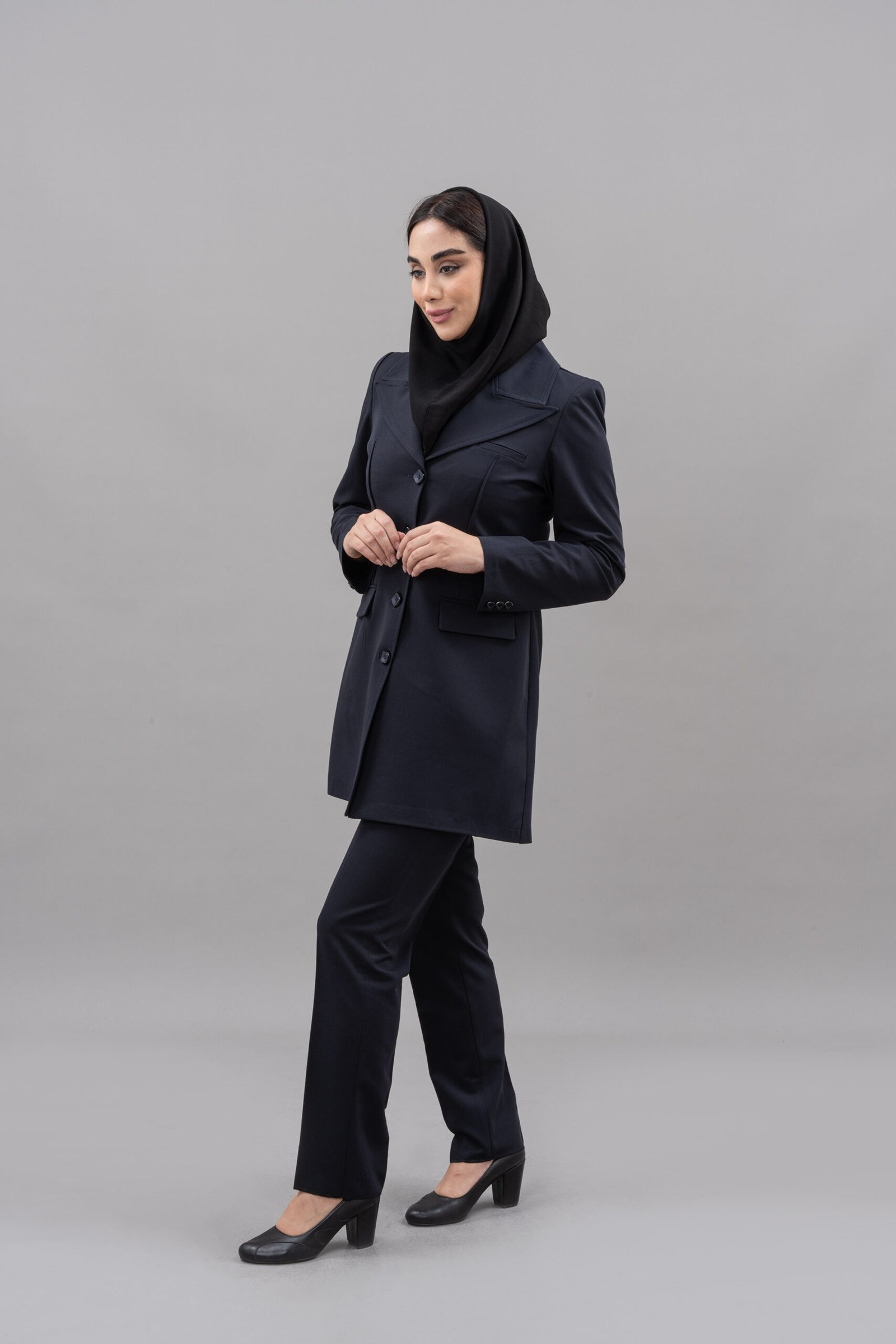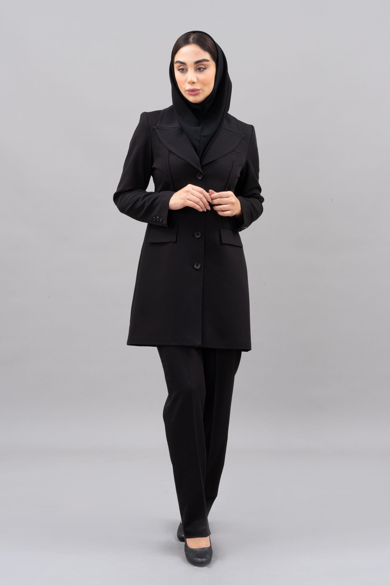 مانتو دارای یقه بلیزر و آستین کتی است که ظاهری رسمی و ساختاریافته به آن می‌بخشد. تن‌خور معمولی و طراحی دو جیب در مانتو، کاربردی بودن و استایل شیک آن را تکمیل می‌کند. شلوار این مدل نیز با برش استاندارد، ظاهری رسمی و متناسب ایجاد کرده که به راحتی با سایر لباس‌های اداری هماهنگ می‌شود.